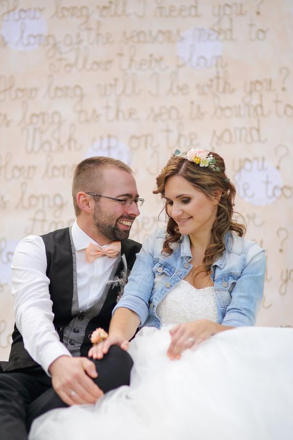 Text piesne sa ocitol aj na našej fotostene, ktorú som vyrábala na dvakrát. Na fotkách môžete vidieť jeho druhú verziu. Prvá sa fotiek nedočkala…ale to je už iný príbeh… O tom, ako som plánovala našu svadbu si môžeš prečítať seriál, ktorého prvý diel nájdeš tuto.